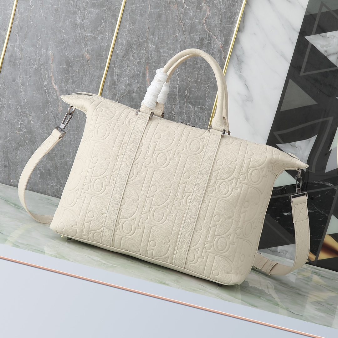 645 Weekender 40 HandbagBeige Dior Gravity printed leather and beige grain cowhide, 000Number: 1ESDU134LLG_H115Size: 57.5 x 34.5 x 22 centimeters (length x height x width)This Weekender 40 handbag features a classic and elegant design. The Dior Gravity printed effect leather uses embossing technology to delicately present classic patterns on beige cowhide, adorned with the Dior logo, fully showcasing the exquisite craftsmanship of the Dior workshop. Equipped with a spacious zipper compartment, it can store various daily necessities for short-term travel. Paired with adjustable and detachable shoulder straps and a top leather handle, it can be carried by hand or shoulder back. Nylon internal zipper, main compartment, internal zipper pocket, leather top handle, adjustable and detachable leather shoulder strap with lobster buckle protective metal feet, front metal cover with brass Dior logo, inner side decorated with Dior embossed logo, dust bag made in Italy