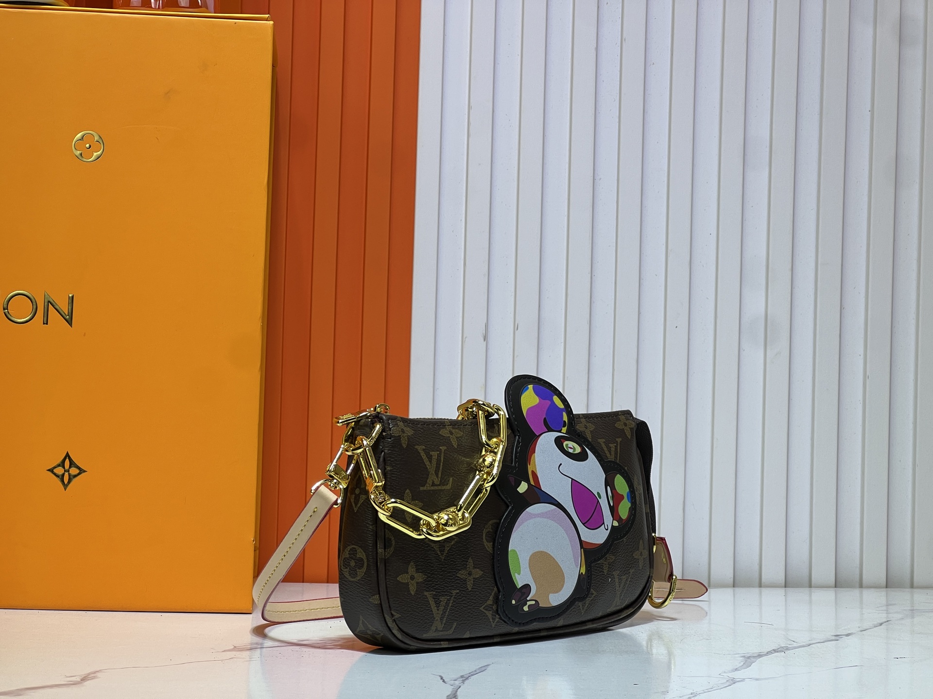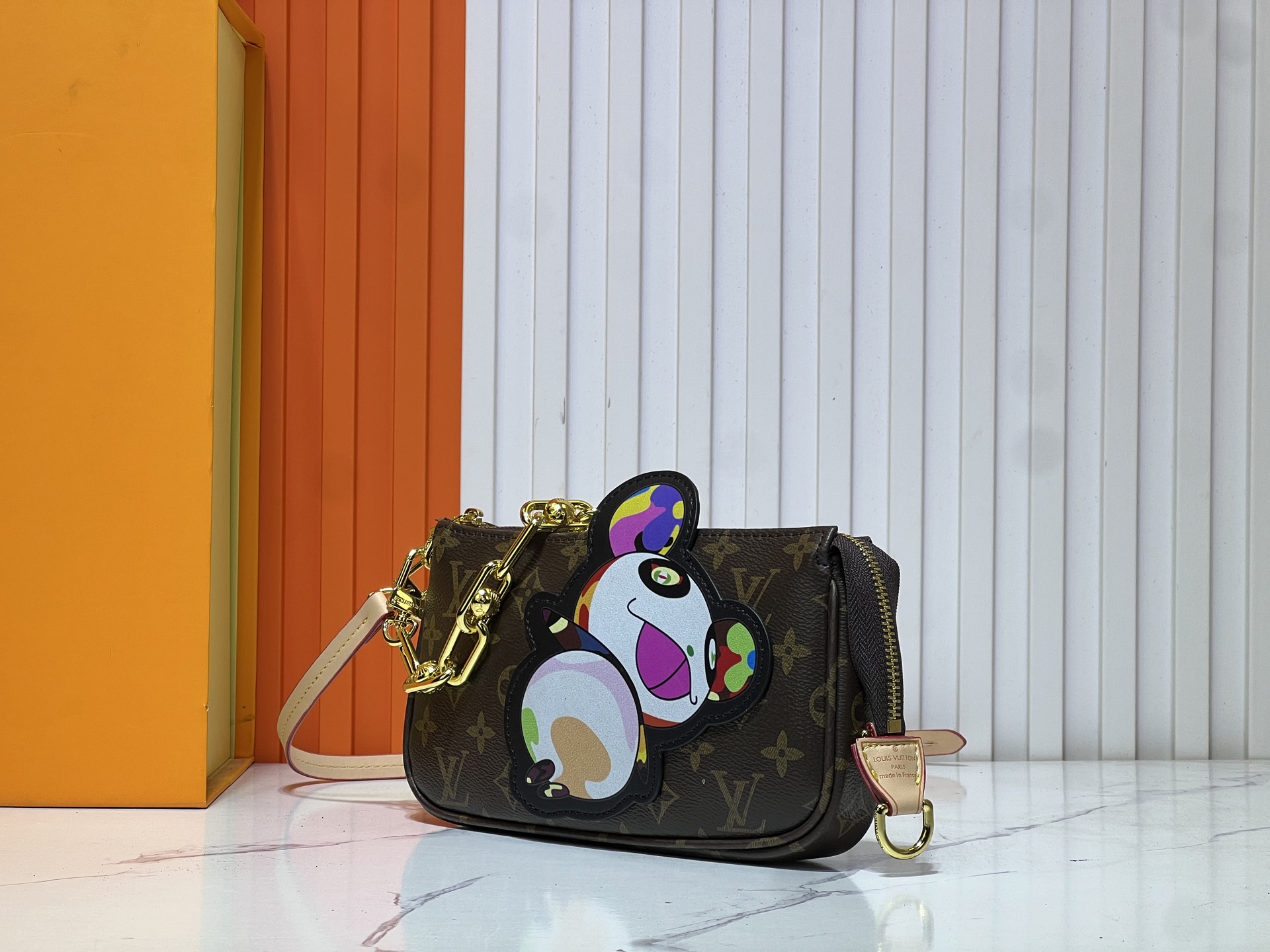 M13440 This Pochette Accessories handbag is made of Monogram coated canvas, designed for Louis VuittonVuitton x Murakami Takashi’s reissued collection injects lively personality. The colorful panda shape depicted by the artistFeaturing a refreshed classic silhouette, the zipper design ensures secure storage of everyday items. Cow leather shoulder straps andThe dazzling chain can be disassembled and can be carried in multiple ways. Size: 22X13X4cm